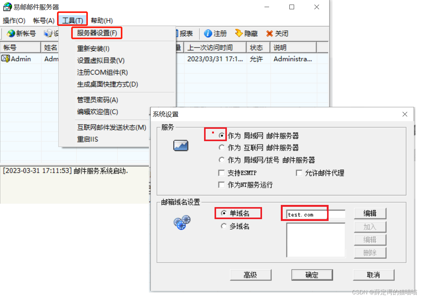 二、先打开易邮邮件服务器,选择 工具 --> 服务器设置,按如图所示进行配置,其中域名可以任意设置,形如 xxx.com, 此处以 test.com 为例,点击确定。