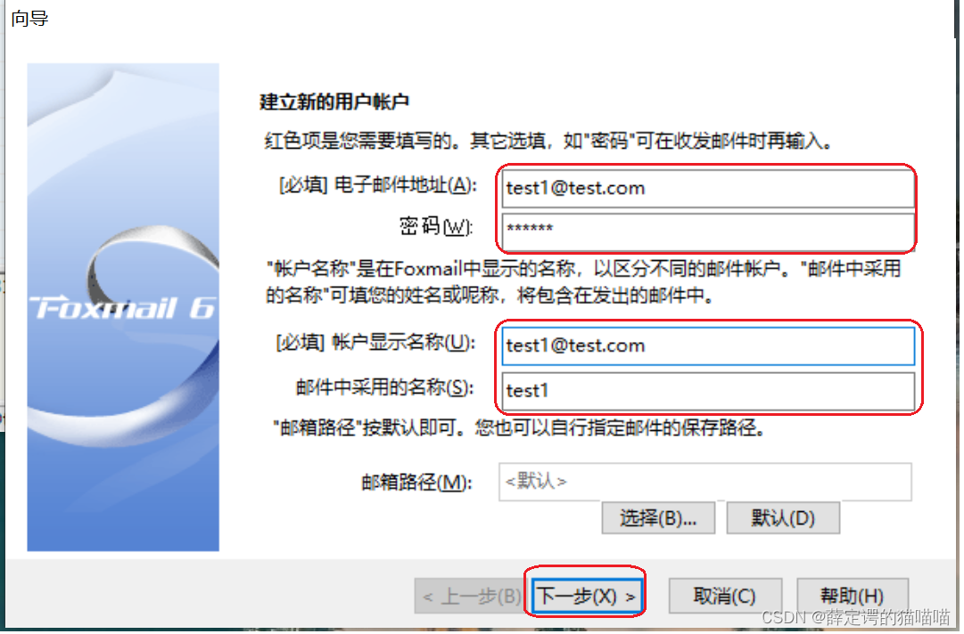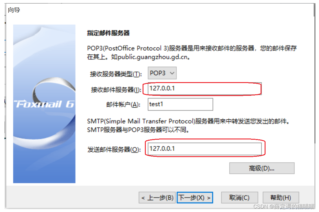 注意 接受邮件 以及 发送邮件服务器填本机的 ip 或者 127.0.0.1 , 下一步。