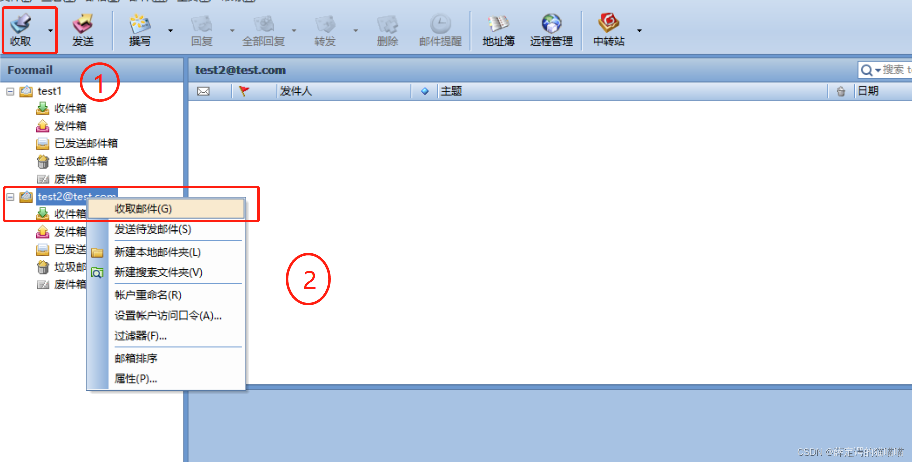 test1账户撰写邮件发给test2。收取邮件有两种方式,如图: