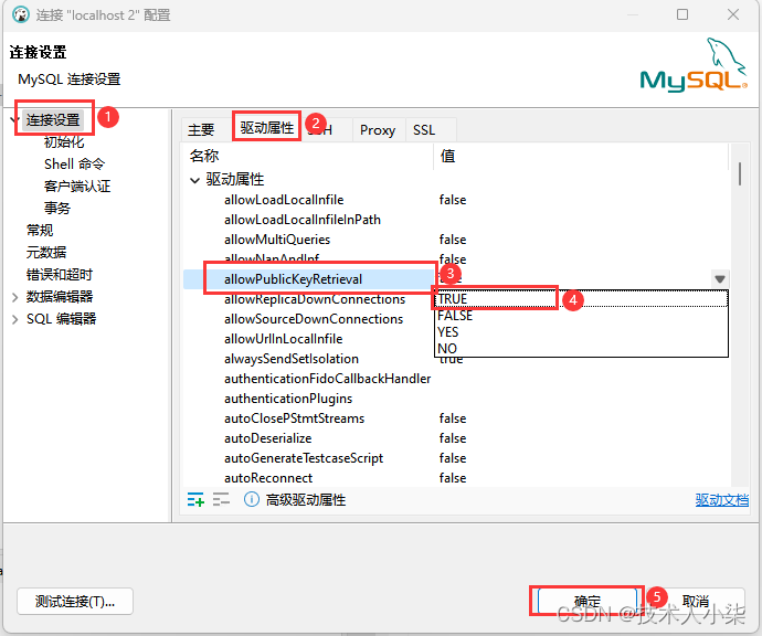 2.2 在“连接设置”中选择“驱动属性”,将“allowPublicKeyRetrieval”值改为“TRUE”,点击确定,再次连接就可以连接成功了。