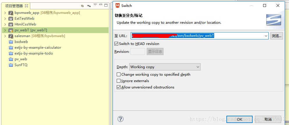 3.主版本SVN点击切换版本--》选择切换哪个分支