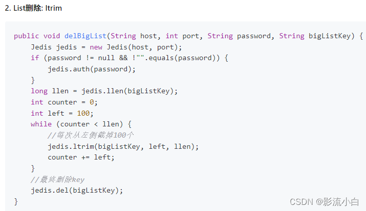 jedis.ltrim(key, start, end):这个方法用于保留指定列表中的指定区间的元素,其他元素将被删除。