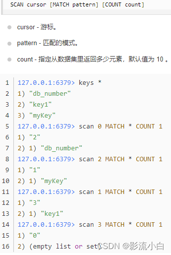 - cursor 游标,首次使用应当设置为0,命令返回的首个结果,就是下次使用命令的cursor
