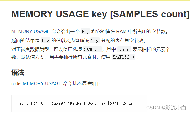 memory usage key [Samples count] 对于嵌套式数据还可以加上一个count来表示抽样查询该key内的元素的个数,设为0表示查询所有。