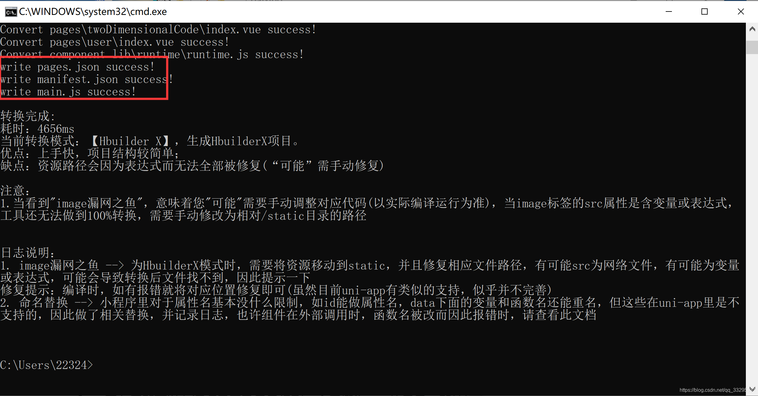 第三步:在命令行里,输入【wtu -i "你的小程序项目路径" -o "输出目录,可不填"】,如:【wtu -i "C:\project\WeChatProjects\baixing"】 ,回车后即可以在源项目同及目录得到一个后缀为_uni的目录,即转换成功。