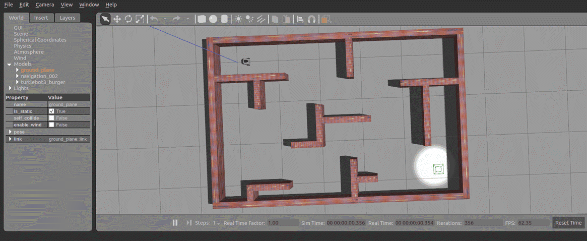 如安装无问题,则会弹出gazebo软件界面,其中有一个turtlebot3提供的默认地图,以及turtlebot3 burger机器人。