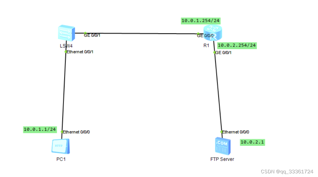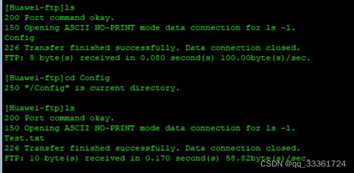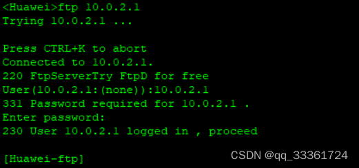 (3)启动FTP Server,在R1上连接FTP服务器,输入时创建用户名10.0.2.1,密码huawei