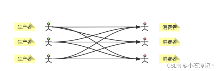 可以看到,三个生产者,三个消费者就会产生 3 * 3 = 9条调用关系(箭头方法代表数据走向),还有一点就是消费者也有可能还是生产者,生产者也有可能还是消费者,一旦生产者、消费者的数量多了之后就会形成复杂的调用网。所以生产者-消费者模型的最大好处就是解耦。