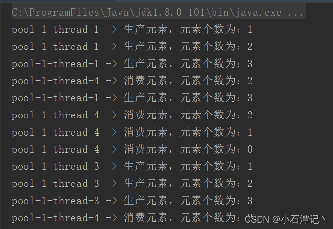 QUEUE_MAX_SIZE),所以缓冲区元素不会超过3,说明缓冲区满时,生产者确实被阻塞了- 缓冲区元素个数最小为0,不会出现负数,说明缓冲区为空时,消费者被阻塞了