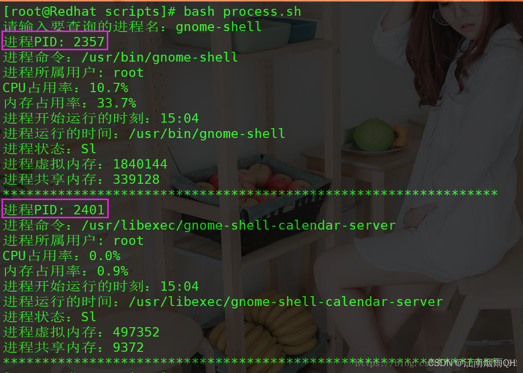 echo "进程所属用户: `ps -aux| awk '$2~/^'$P'$/{print $1}'`"