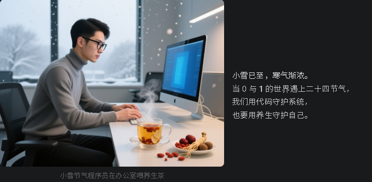 小雪节气提醒我们:冬季养生,重在"藏"——藏阳气、藏精力、藏健康。程序员的"藏"不是躺平,而是用更聪明的方式工作、生活。