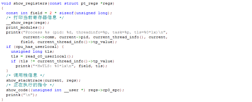 在linux中对mips体系结构代码中,主要是通过异常处理的方式,在产生异常时将当前的寄存器状态,线程状态,加载的模块及函数调用信息,打印处理,为内核debug提供尽可能多的信息。