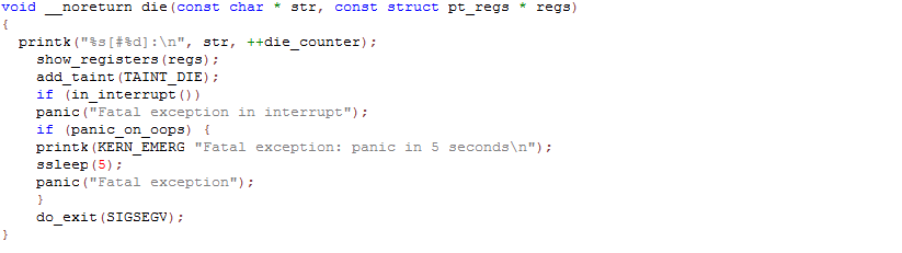 OOPS会显示出CPU在崩溃时的状态,包括CPU寄存器和其它一些看起来难懂的信息。其实现代码在内核的arch\xxx\kernel\traps.c中。