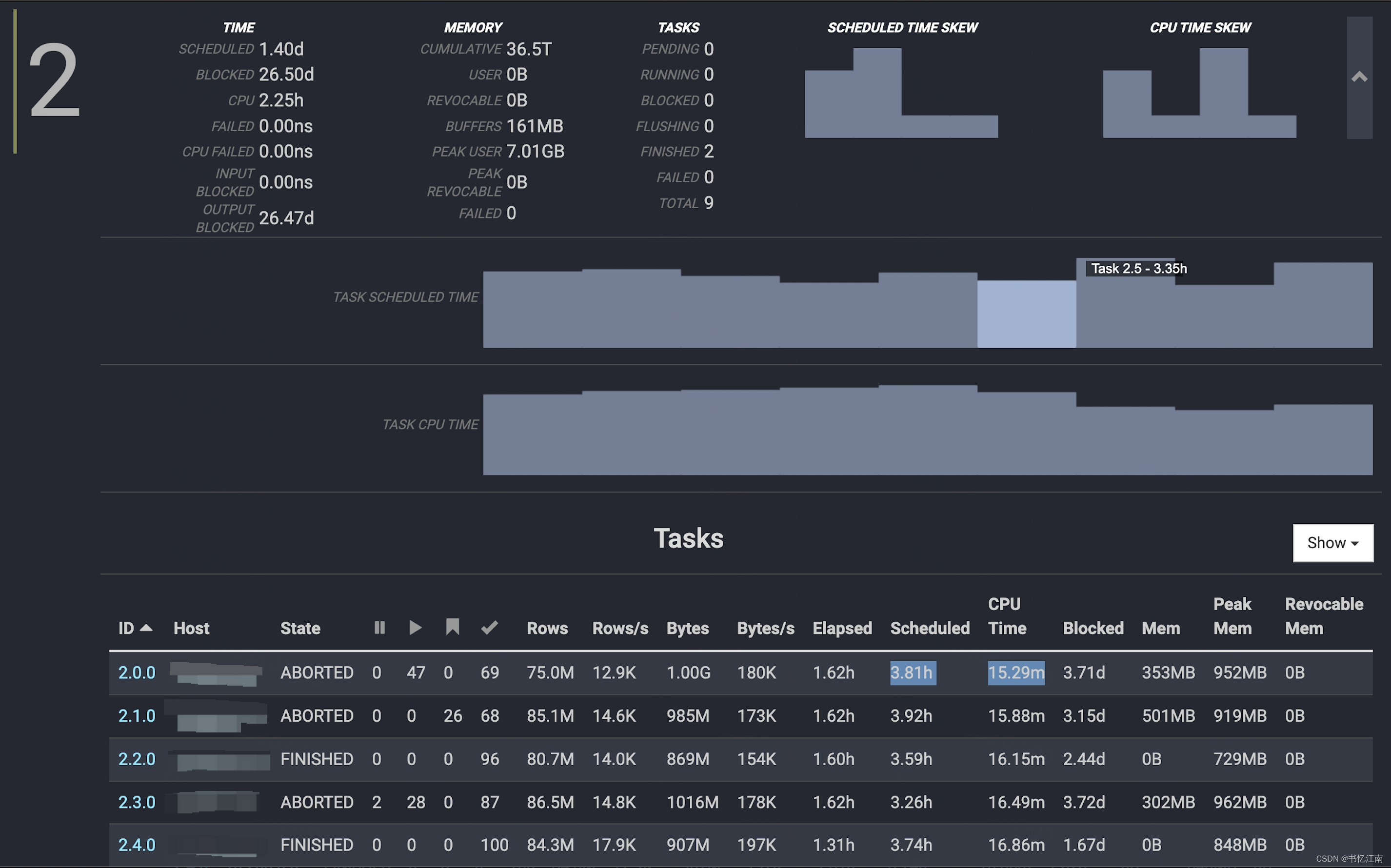 如果是混布架构下出现如下迹象,则Trino可能有点抢不到CPU,即查询Overview界面里,某些stage的调度时间远高于CPU时间: