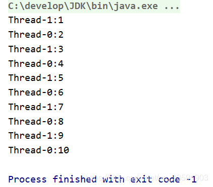 依照题意:线程0打印1,线程1打印2,接着再次这样循环,一直到输出10为止。