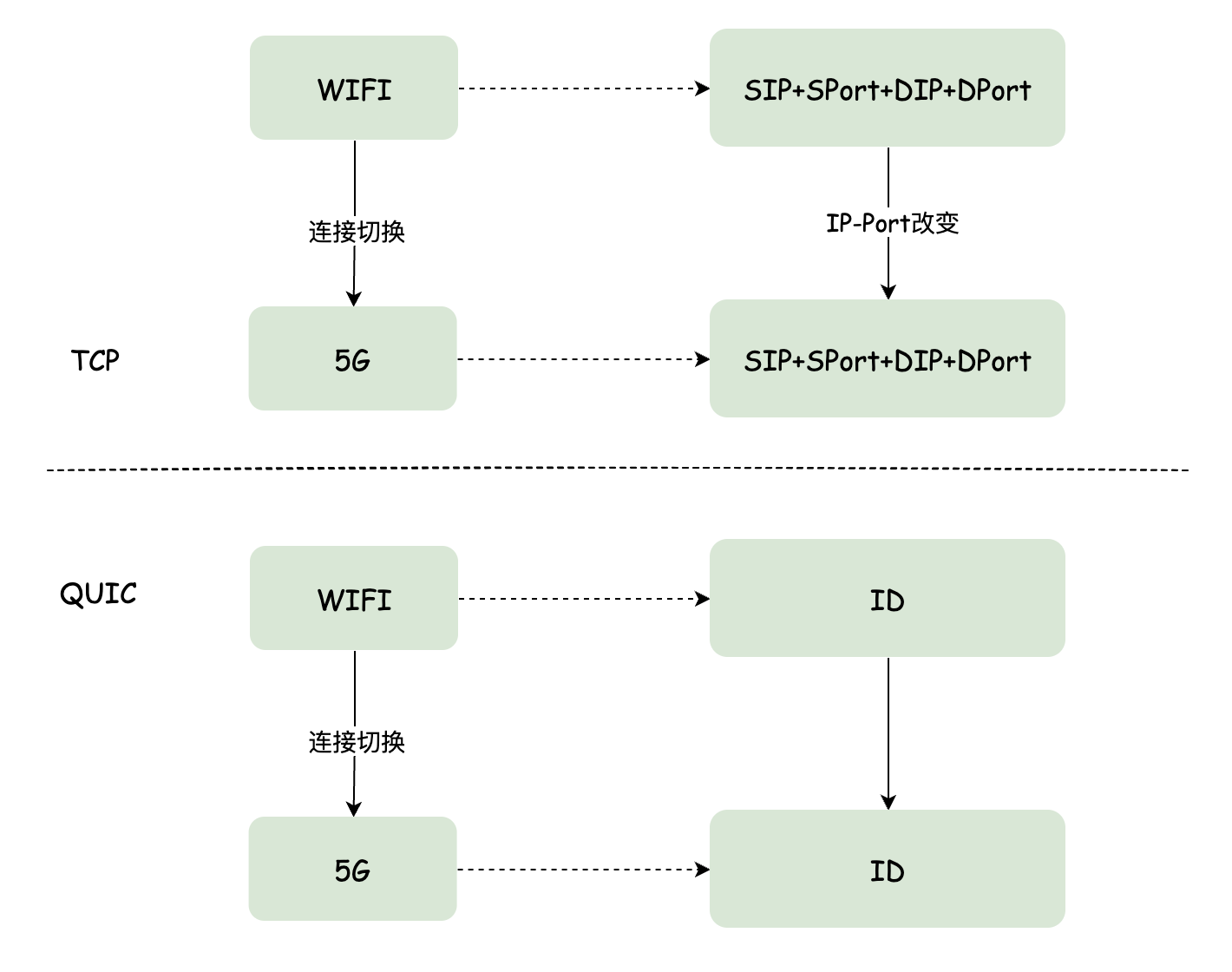 考虑到现在普通使用移动互联,一会在家连个wifi,一会出门自动换到4G或者5G,进个奶茶店又连上了WIFI。如果使用TCP连接,那么会连接多次断开重连,造成不好的用户体验。因此,QUIC支持了连接迁移的功能。
