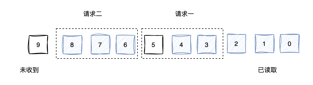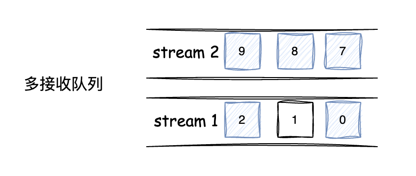 但是,虽然应用层不存在队头阻塞的问题了,由于HTTP底层是TCP协议,多个stream仍然是复用一条TCP连接,所以当多个请求到达服务端,接收队列可能是这个样子的: