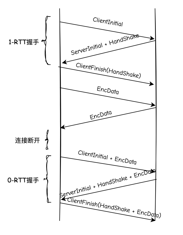 - 当客户端希望重新连接到服务器时,它使用保存的服务器参数计算出前一个1-RTT阶段的会话密钥,用这个密钥加密数据发送。同时,开启一个1-RTT的协商流程。