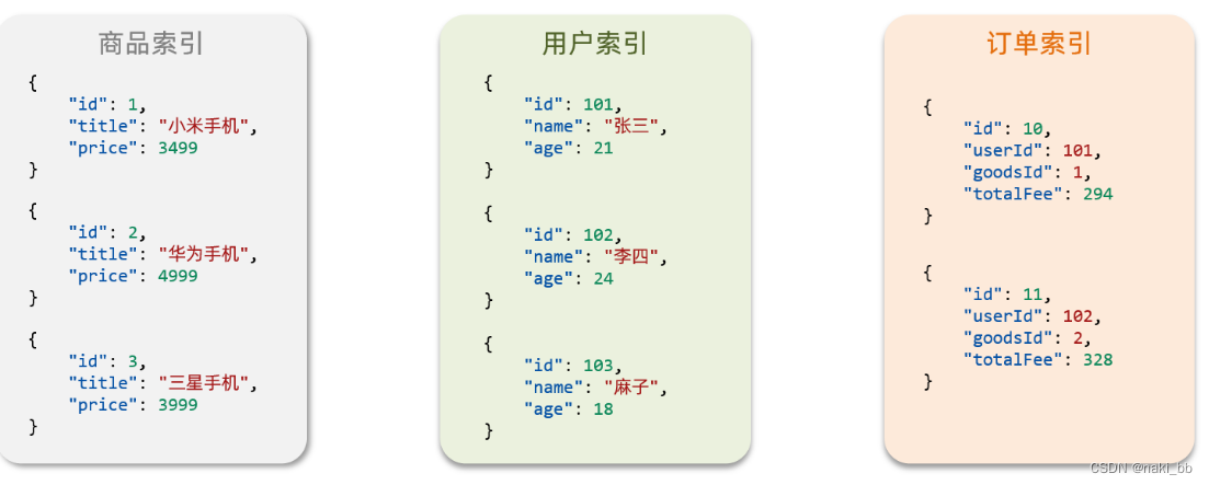 elasticsearch是面向文档(Document)存储的,可以是数据库中的一条商品数据,一个订单信息。文档数据会被序列化为json格式后存储在elasticsearch中: