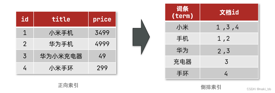 而倒排索引则相反,是先找到用户要搜索的词条,根据词条得到保护词条的文档的id,然后根据id获取文档。是根据词条找文档的过程。