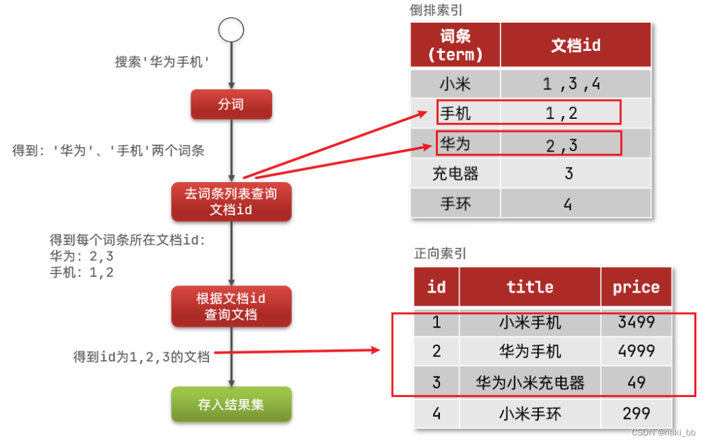 倒排索引的搜索流程如下(以搜索"华为手机"为例):