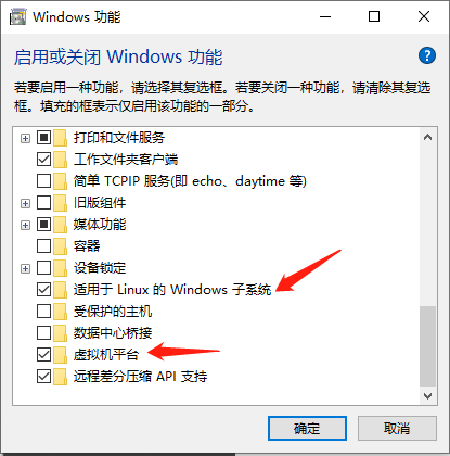 (1).搜索并打开“启用或关闭Windows功能”,勾选“适用于Linux的Windows子系统”和"虚拟机平台"和"Hyper-v",点击确定重启电脑(最好不要稍后才重启,或者先取消)。