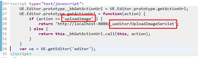 <!DOCTYPE HTML PUBLIC "-//W3C//DTD HTML 4.01 Transitional//EN" "http://www.w3.org/TR/html4/loose.dtd"> <html> <head> <title>使用自己定义的上传类</title> <meta http-equiv="Content-Type" content="text/html;charset=utf-8"/> <script type="text/javascript" charset="utf-8" src="ueditor.config.js"></script> <script type="text/javascript" charset="utf-8" src="ueditor.all.min.js"> </script> <!--建议手动加在语言,避免在ie下有时因为加载语言失败导致编辑器加载失败--> <!--这里加载的语言文件会覆盖你在配置项目里添加的语言类型,比如你在配置项目里配置的是英文,这里加载的中文,那最后就是中文--> <script type="text/javascript" charset="utf-8" src="lang/zh-cn/zh-cn.js"></script> <style type="text/css"> div{ width:100%; } </style> </head> <body> <div> <h1>使用自己定义的上传类</h1> <textarea id="editor" type="text/plain" style="width:1024px;height:500px;"></textarea> </div> <script type="text/javascript"> UE.Editor.prototype._bkGetActionUrl = UE.Editor.prototype.getActionUrl; UE.Editor.prototype.getActionUrl = function(action) { if (action == 'uploadimage' ) { return 'http://localhost:8080/_ueditor/UploadImageServlet'; } else { return this._bkGetActionUrl.call(this, action); } } var ue = UE.getEditor('editor'); </script> </body> </html>- 注意: