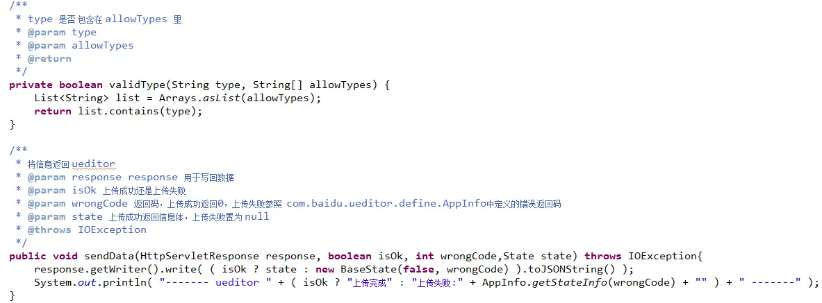 protected void doPost(HttpServletRequest request, HttpServletResponse response) throws ServletException, IOException { System.out.println("------- ueditor 图片上传 -------"); FileItemStream fileStream = null; boolean isAjaxUpload = request.getHeader( "X_Requested_With" ) != null; if (!ServletFileUpload.isMultipartContent(request)) { sendData( response, false, AppInfo.NOT_MULTIPART_CONTENT , null); return ; } ServletFileUpload upload = new ServletFileUpload( new DiskFileItemFactory()); if ( isAjaxUpload ) { upload.setHeaderEncoding( "UTF-8" ); } try { FileItemIterator iterator = upload.getItemIterator(request); while (iterator.hasNext()) { fileStream = iterator.next(); if (!fileStream.isFormField()) break; fileStream = null; } if (fileStream == null) { sendData( response, false, AppInfo.NOTFOUND_UPLOAD_DATA , null); return ; } // 得到 得到 新路径格式+名称格式 String savePath = this.savePath; // 得到 原文件名 String originFileName = fileStream.getName(); // 得到 原文件名后缀 String suffix = FileType.getSuffixByFilename(originFileName); // 将 originFileName 去掉原文件名后缀 originFileName = originFileName.substring(0, originFileName.length() - suffix.length()); // 得到 新路径格式+名称格式+后缀 savePath = savePath + suffix; // 得到 文件上传大小限制,单位B int maxSize = this.maxSize; // 得到允许上传的图片格式数组 String[] allowTypes = this.allowTypes; if (!validType(suffix, allowTypes) ) { sendData( response, false, AppInfo.NOT_ALLOW_FILE_TYPE , null); return ; } // 根据 新路径格式+名称格式+后缀 以及 原文件名 产生新的保存路径和名称 savePath = PathFormat.parse(savePath, originFileName); // 得到 保存至图片服务器的 图片访问路径前缀 String rootPath = request.getSession().getServletContext().getRealPath( "/" ); rootPath = rootPath.substring( 0 , rootPath.length() ); String physicalPath = rootPath + savePath; // 将上传图片保存至 硬盘 InputStream is = fileStream.openStream(); State storageState = StorageManager.saveFileByInputStream(is, physicalPath , maxSize); is.close(); if (storageState.isSuccess()) { storageState.putInfo("url", PathFormat.format(savePath)); storageState.putInfo("type", suffix); storageState.putInfo("original", originFileName + suffix); } sendData( response, true, 0 , storageState); return ; } catch (FileUploadException e) { sendData( response, false, AppInfo.PARSE_REQUEST_ERROR , null); return ; } catch (IOException e) { } sendData( response, false, AppInfo.IO_ERROR , null); return ; } -