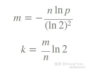 k 为哈希函数个数,m 为布隆过滤器长度,n 为插入的元素个数,p 为误报率。
