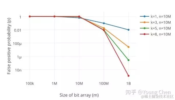 很显然,过小的布隆过滤器很快所有的 bit 位均为 1,那么查询任何值都会返回“可能存在”,起不到过滤的目的了。布隆过滤器的长度会直接影响误报率,布隆过滤器越长其误报率越小。