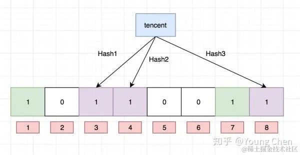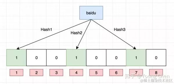 这是为什么呢?答案跟简单,因为随着增加的值越来越多,被置为 1 的 bit 位也会越来越多,这样某个值 “taobao” 即使没有被存储过,但是万一哈希函数返回的三个 bit 位都被其他值置位了 1 ,那么程序还是会判断 “taobao” 这个值存在。