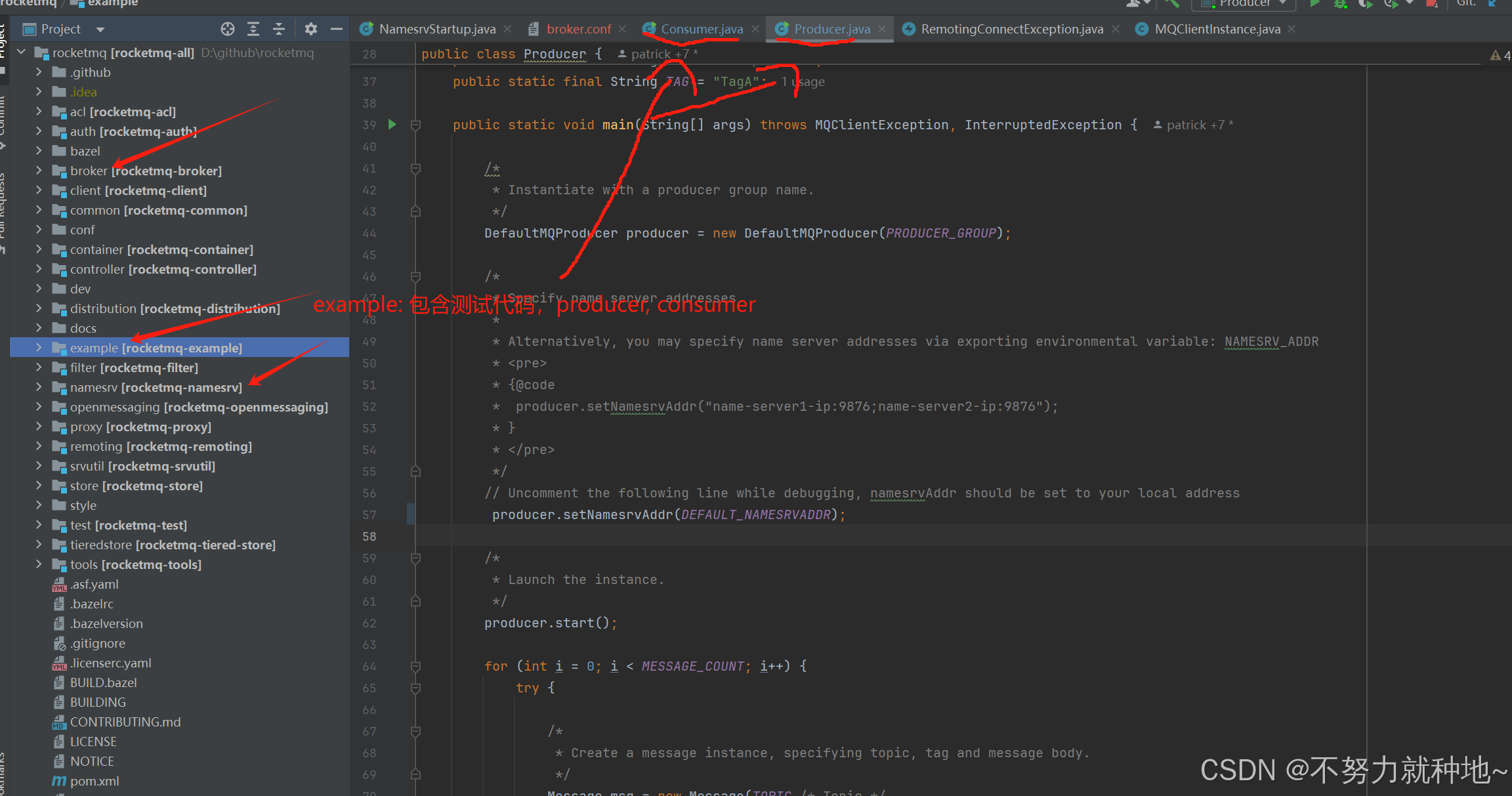 在源码中依次启动namesrv, broker, example 中的producer, consumer即可