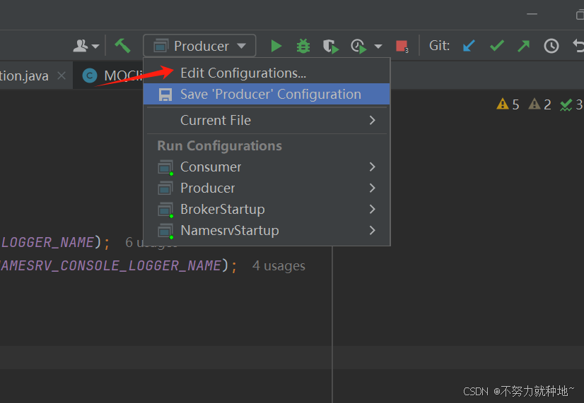 3. 由上可知,一共四个角色,namseSrv,broker, producer, consumer, 对应代码则为: