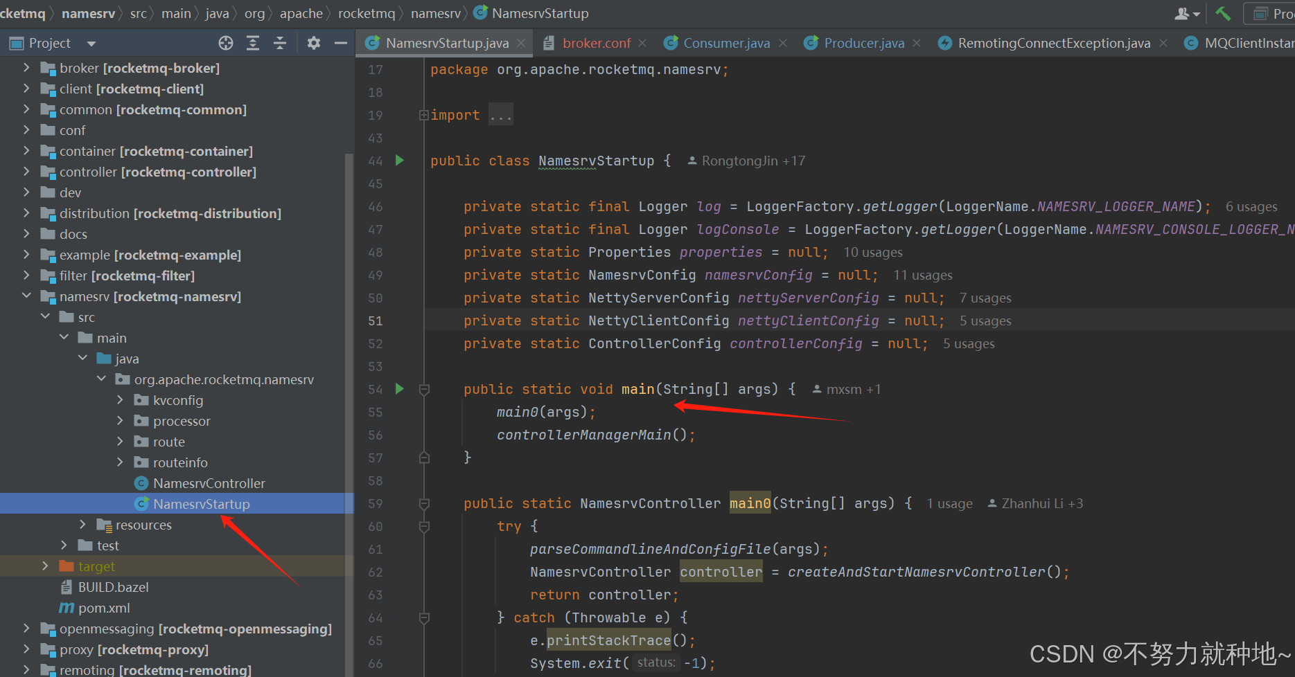 4.1. 找到nameSrv 注册中心的NamesrvStartup类,以及main方法: