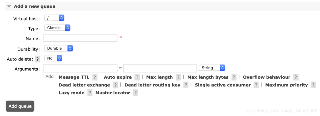- queue(名称、routingkey,kv属性,例如x-message-ttl等)