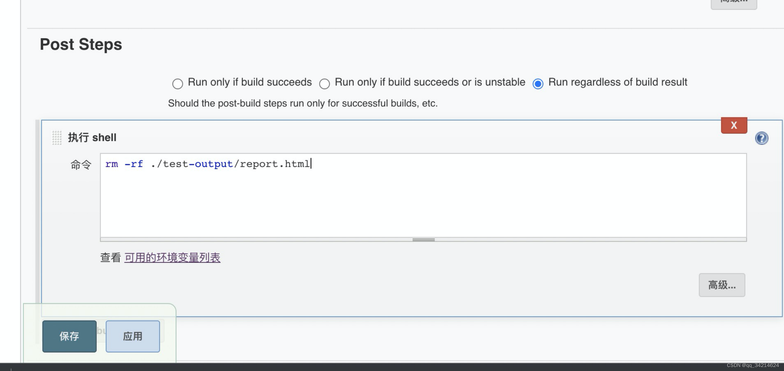 经过同事的帮忙定位后,是因为我在创建报告前删除了依赖文件report.html。因为我在配置的时候加了post Steps的shell命令,意思是无论测试运行结果怎么样,在测试用例执行完以后,都会执行下面的shell。