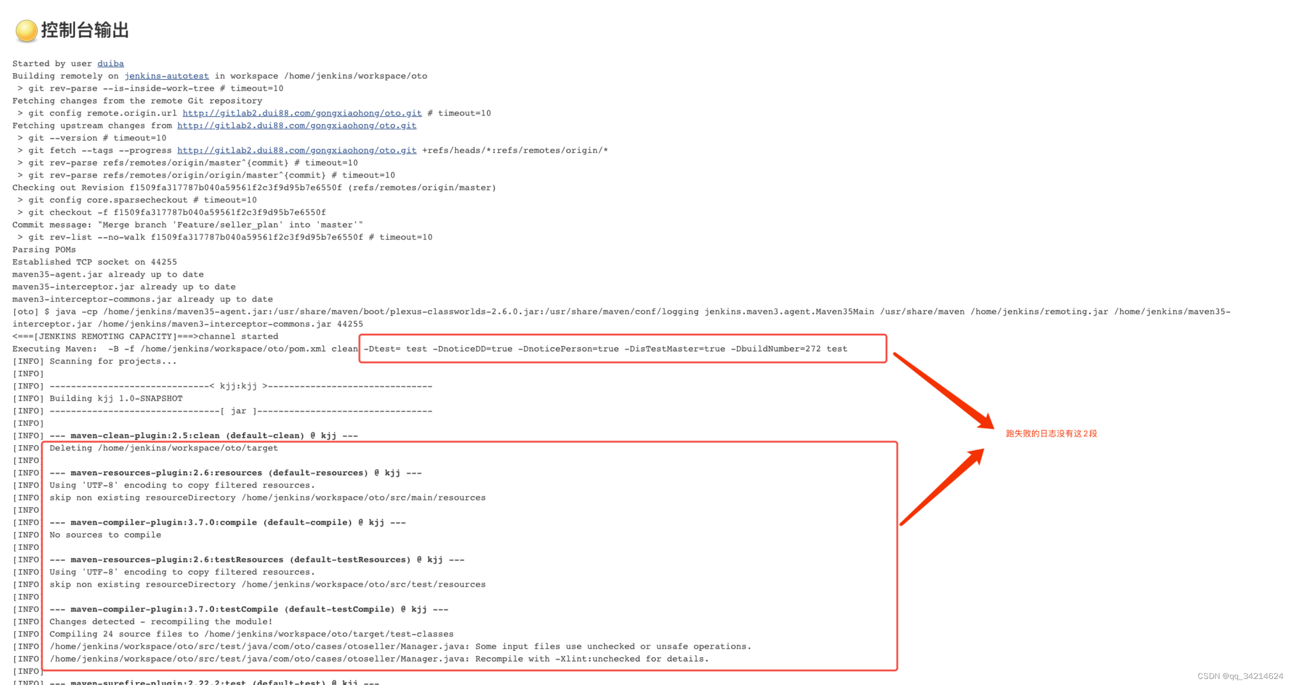 2.定时构建时没有跑项目代码,查看控制台日志和之前正常构建的日志对比,发现执行clean命令时没有指定测试次数和版本。