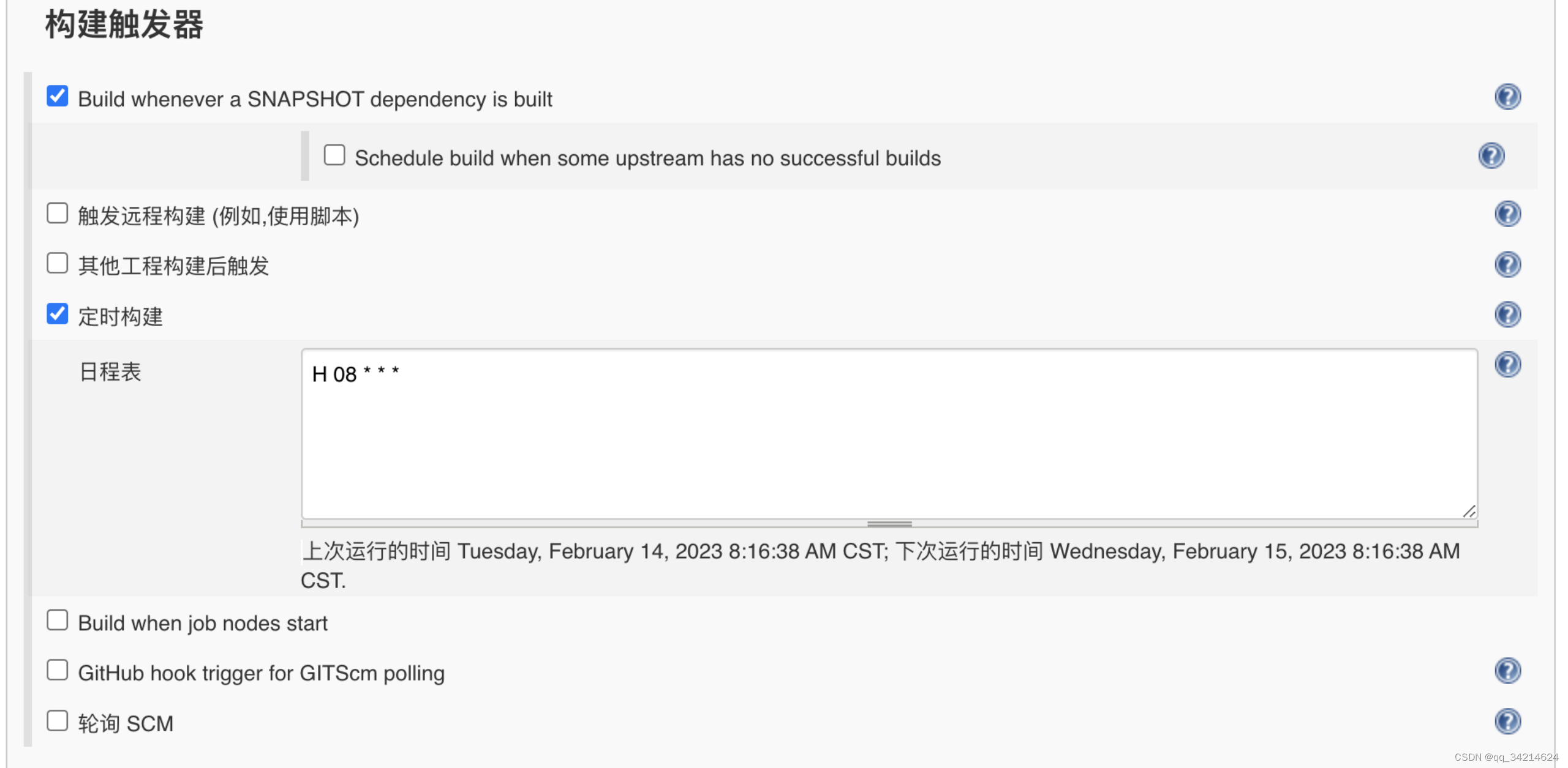 选择定时构建:语法规则为由空格或tab值分开5个的字段组成,这5个字段分别是:分钟/小时/天/月/星期,H代表随机的散列,可为多个任务配置再不同时刻执行。