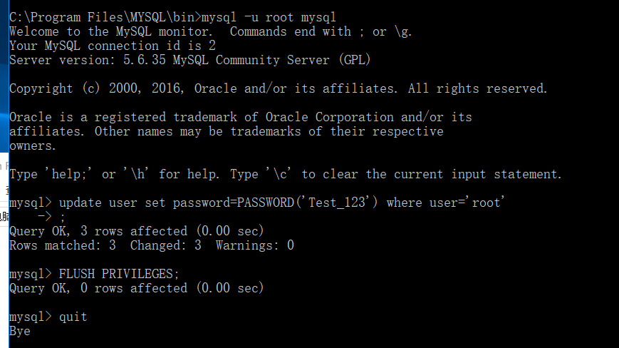 mysql> update mysql.user set password=PASSWORD('123') where user='root';