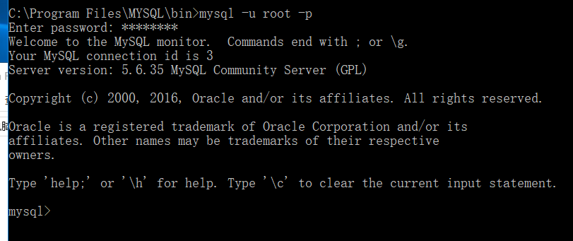 mysql bin目录下,C:\Program Files\MYSQL\bin>mysql -u root mysql ---第一次安装用这个进入数据库
