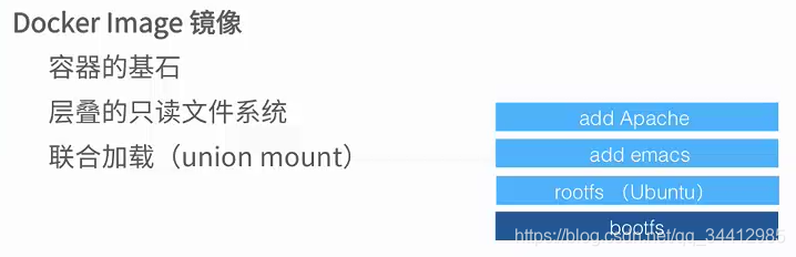 docker最底层的bootfs引导文件系统容器启动后容器会被移动到内存中,bootfs会被卸载掉,rootfs文件系统只能只读,docker使用联合文件加载技术在rootfs之上加载更多的只读文件系统,联合加载指一次同时加载多个文件系统,在外面只能看到一个文件系统,联合加载会将各层文件系统叠加到一起,最终的文件系统会包含所有的底层文件和目录,docker称这样的文件系统为镜像。一个镜像可以放到另一个镜像顶部,下面的镜像为父镜像,最底部镜像为基础镜像。