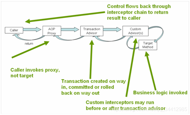 利用aop的proxy,在目标方法上做了层封装,帮助用户进行模板式事务操作,在操作开始前启动事务,在方法执行结束后commit或rollback这个事务。使用java默认的基于接口的动态代理,封装了aspectJ,有切入点Advice,返回值的AfterReturning,在方法执行前有before,在方法后After,抛出异常时AfterThrowing,在这里使用的是Around切入也就是在方法前后去做了一段的增强。