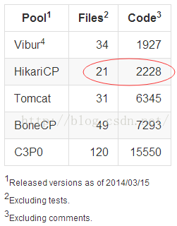 几个连接池的代码量对比(代码量越少,一般意味着执行效率越高、发生bug的可能性越低):