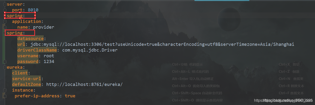 yml文件不允许出现两个spring,而且idea也提示出了错误,加以改正即可