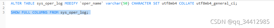 ALTER TABLE sys_oper_log MODIFY `oper_name` varchar(50) CHARACTER SET utf8mb4 COLLATE utf8mb4_general_ci;