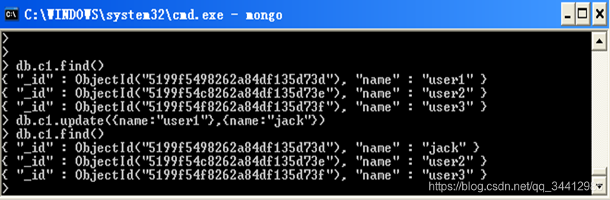 • 更新集合中的文档,将集合中name为user1的文档改成name为jack