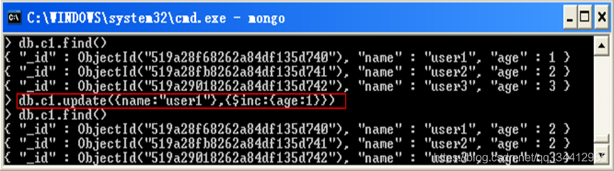 • 更新集合中的文档,使用 $inc 将集合中name为user1的age加1,其它键不变, $inc表示使某个键值加减指定的数值