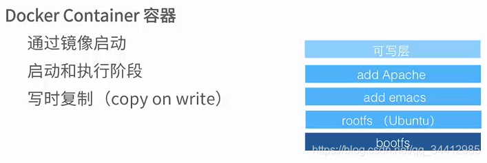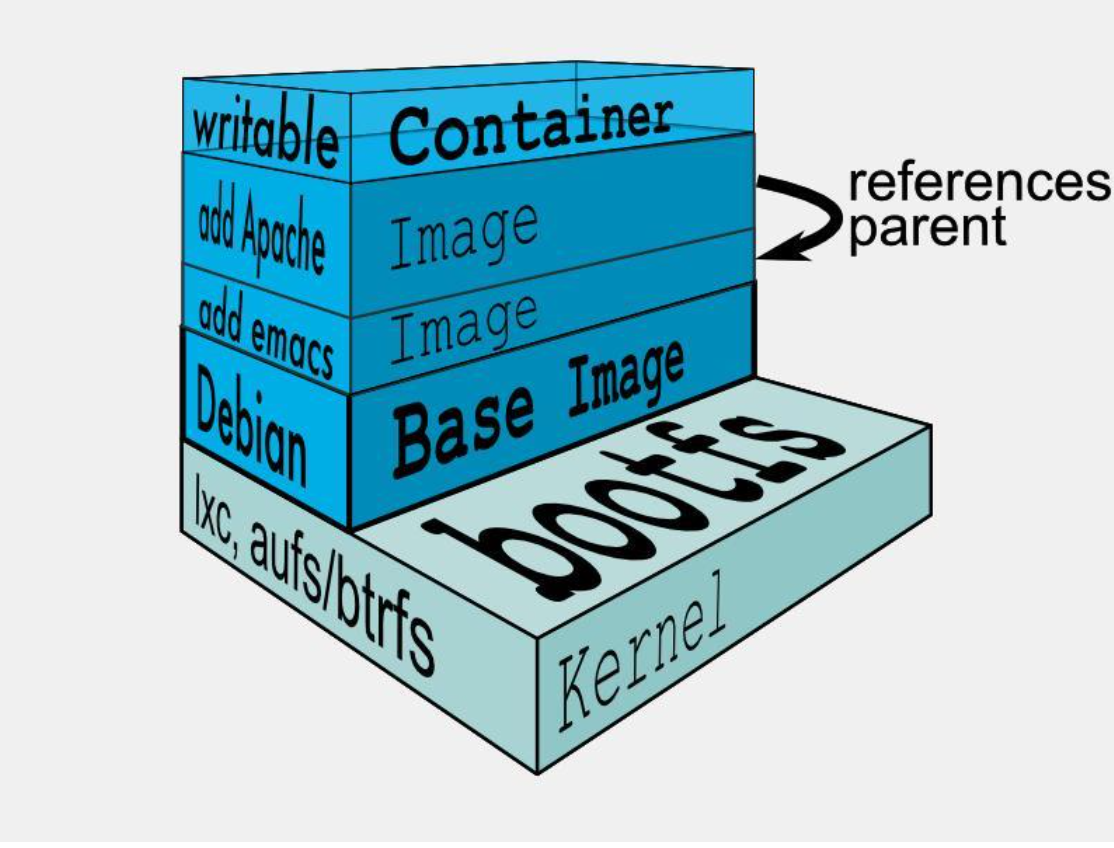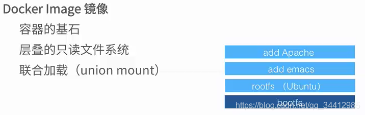 在基础的rootfs image的基础上,叠加了包含例如Emacs等各种工具的image,在叠加包含apache及其相关依赖library的image,这些image由AUFS文件系统加载合并到统一路径中,以只读的方式