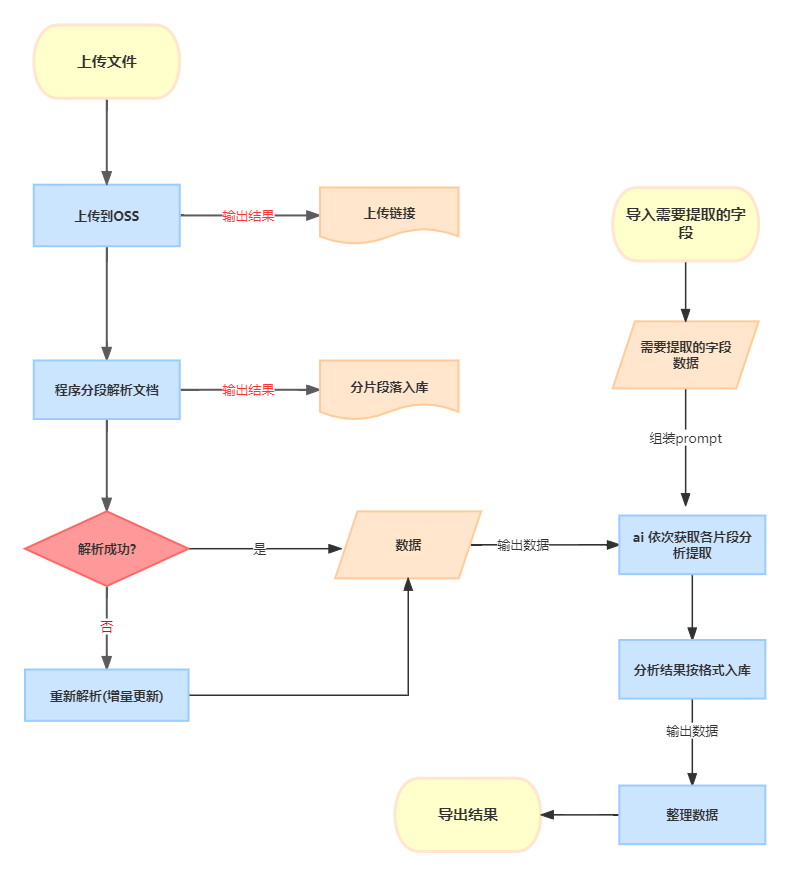 第一步: 在上述处理完成文档转换后,(上传前需要选择合同类型)用户需要将文档上传oss云存储上,上传成功之后,使用程序按照段落分隔文档将文档数据落库;(为什么要这么做?因为调用gpt接口有token 数限制,其次也是为了提高响应速度)可批量操作;上传成功之后展示文件列表信息;