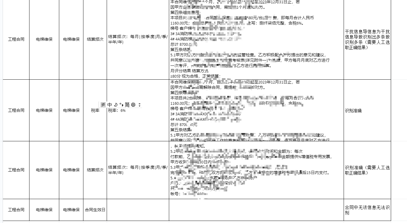 分包类型/维保价格/计算频次 受干扰信息影响,识别出了多个结果,需要人工对照原文进行选择;